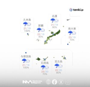• 名護 (Nago): 🌧 | 21 / 18 | 90%
