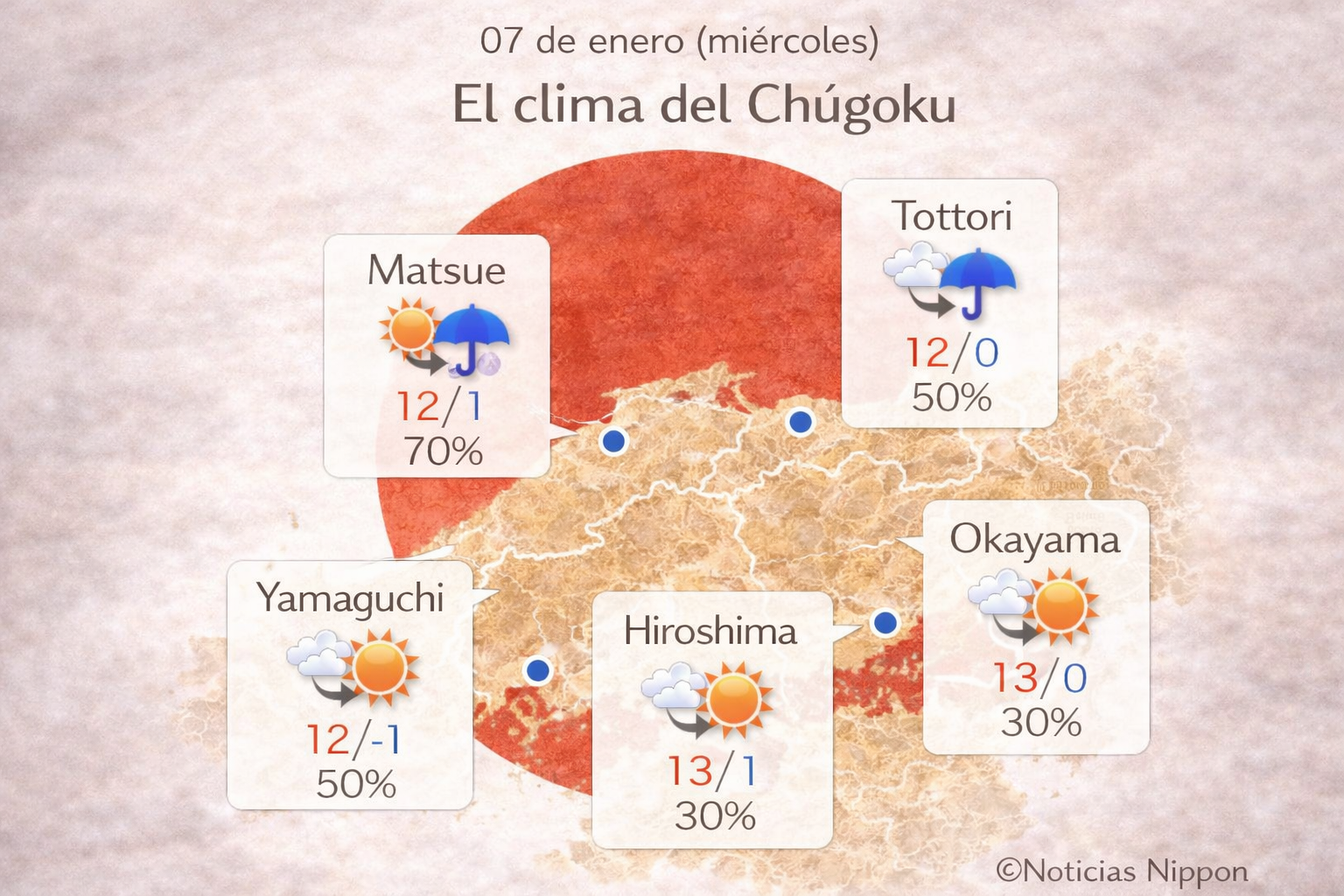 En Hiroshima y Okayama, en cambio, el clima será más estable, con 13°C de máxima y 30% de probabilidad de lluvia. Yamaguchi se mantiene similar, frío pero con ratos de sol.
