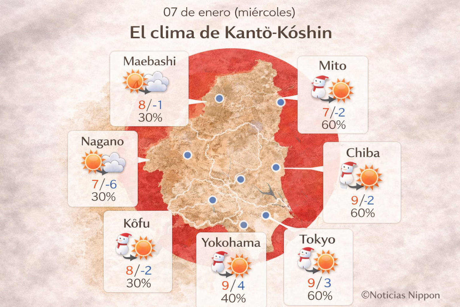 Tokio, Yokohama, Chiba, Saitama, Maebashi, Nagano y Kōfu tendrán máximas entre 7°C y 9°C. Las mínimas bajarán hasta –6°C en Nagano y cerca de 0°C–3°C en el resto.
