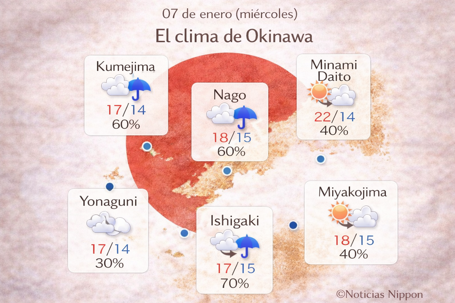 En Nago, Kumejima e Ishigaki hay 60–70% de probabilidad de lluvia, mientras que en Miyakojima y Minami Daito el cielo estará más despejado.