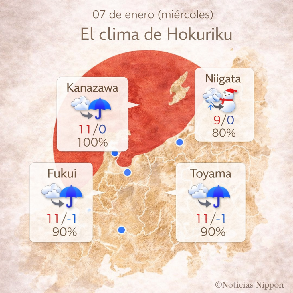 Kanazawa tendrá 100% de probabilidad de lluvia, mientras que Fukui y Toyama estarán cerca del 90%. Las temperaturas serán relativamente suaves, con máximas de 11°C y mínimas entre 0°C y –1°C.