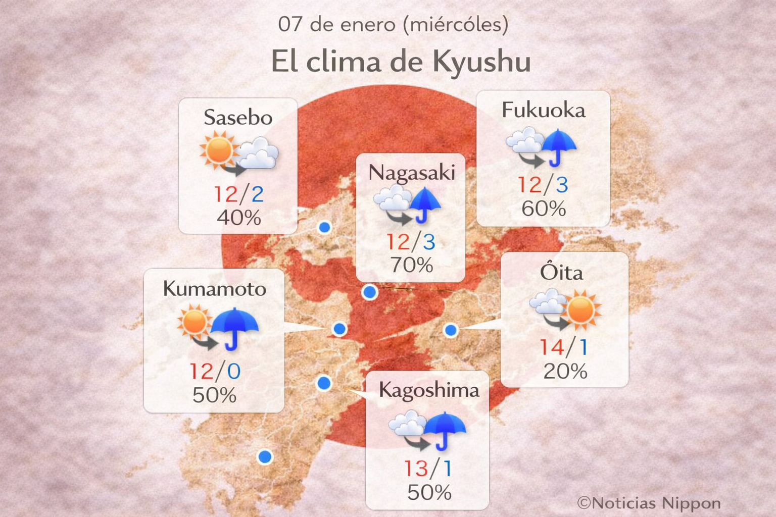 En Kyūshū habrá lluvias intermitentes, sobre todo en Fukuoka y Nagasaki, donde la probabilidad llega al 60–70%. Las temperaturas máximas estarán alrededor de 12°C a 14°C, con mínimas de 0°C a 3°C.