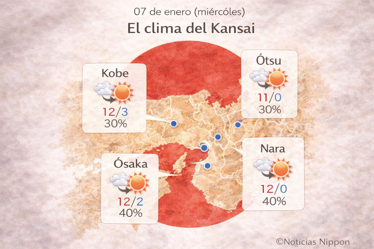 En Kansai predominará el cielo parcialmente despejado. Osaka, Kobe, Nara y Ōtsu tendrán máximas de 11°C a 12°C, con mínimas entre 0°C y 3°C.