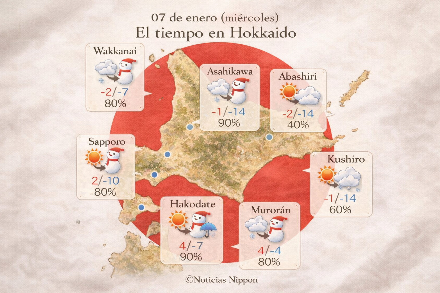 En Hokkaidō dominará el frío intenso y la nieve. En ciudades como Sapporo, Abashiri y Hakodate, la temperatura máxima rondará los –2°C a 4°C, mientras que las mínimas bajarán hasta –7°C o incluso –14°C en zonas como Asahikawa y Kushiro. La probabilidad de nieve es alta, especialmente en Asahikawa y Hakodate, donde alcanza hasta el 90%. Mucho cuidado al caminar o conducir: habrá hielo en calles y veredas.