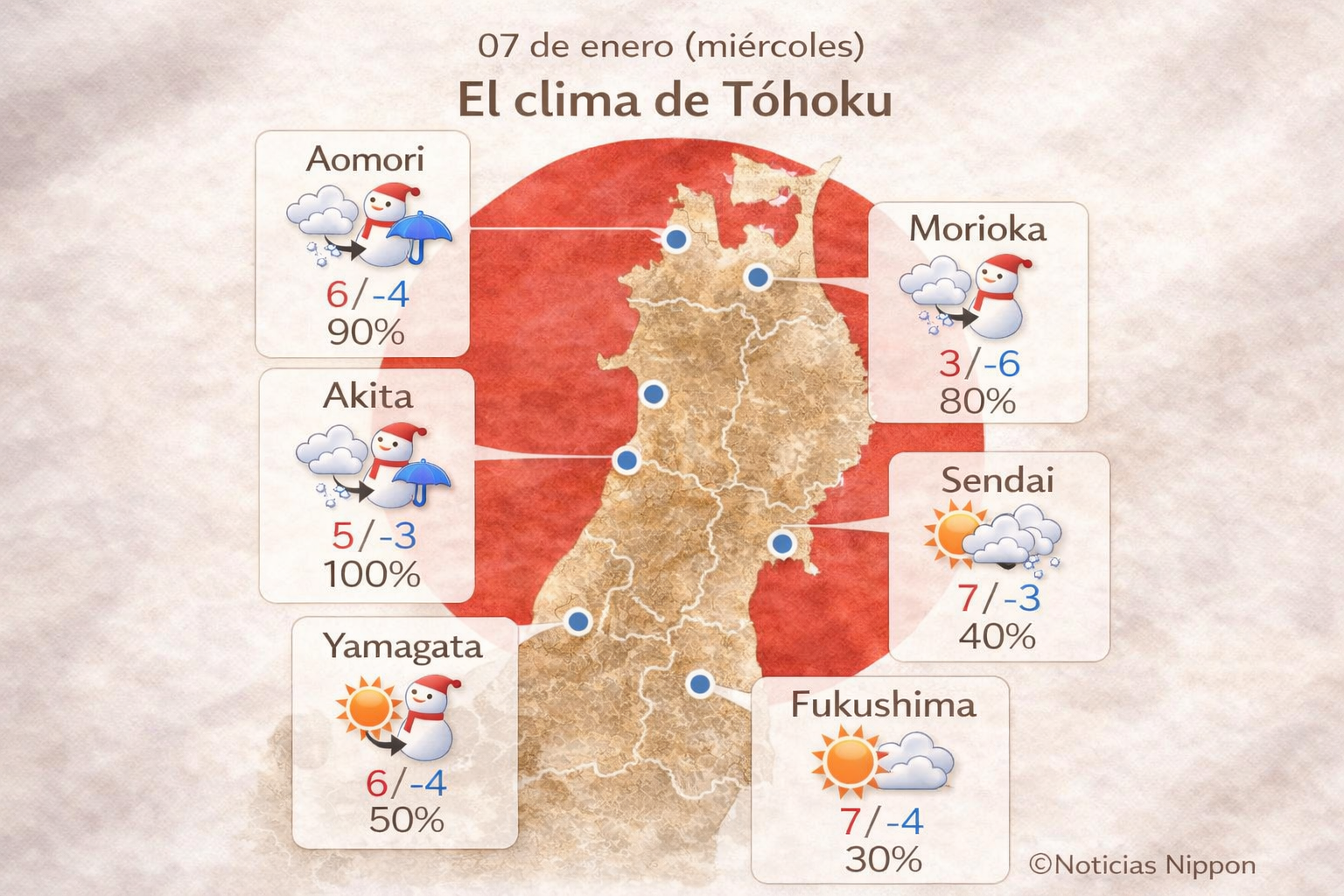 Aomori y Akita tendrán alta probabilidad de precipitación (90–100%) con máximas alrededor de 5°C–6°C. En Morioka, el frío será más seco pero con 80% de probabilidad de nieve.
