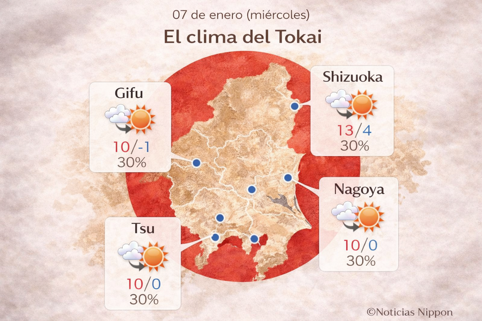 En la región de Tokai el clima será tranquilo y seco. Nagoya, Gifu, Tsu y Shizuoka tendrán máximas entre 10°C y 13°C, con mínimas cercanas a 0°C. La probabilidad de lluvia será baja, alrededor del 30%. Un día frío pero estable.