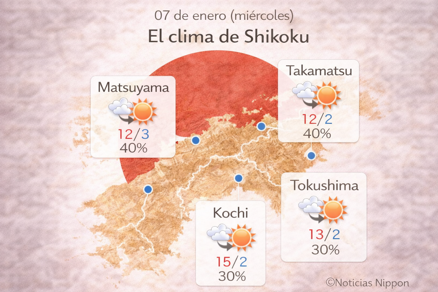 En Shikoku el clima será estable, con nubes y sol intercalados. Matsuyama y Takamatsu registrarán máximas de 12°C, mientras que Kochi llegará a 15°C. Las mínimas estarán entre 2°C y 3°C. La probabilidad de lluvia será baja, entre 30% y 40%.