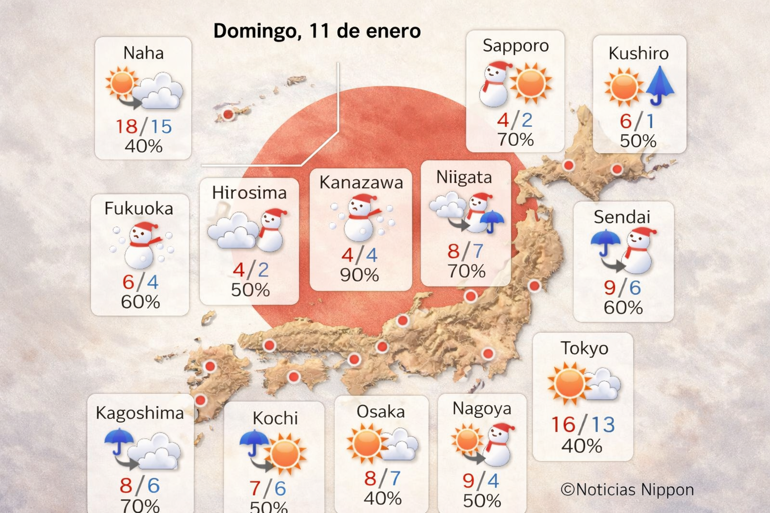 • Riesgos: carreteras resbaladizas en Hokuriku, Tōhoku y Hokkaidō.