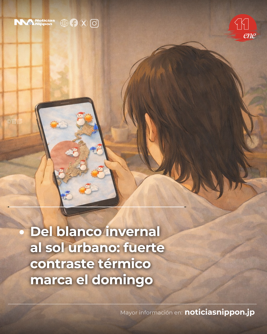Un domingo que refleja claramente el invierno japonés: mientras algunos disfrutan del sol en Tokio, otros enfrentan paisajes nevados al estilo de Hokkaidō.