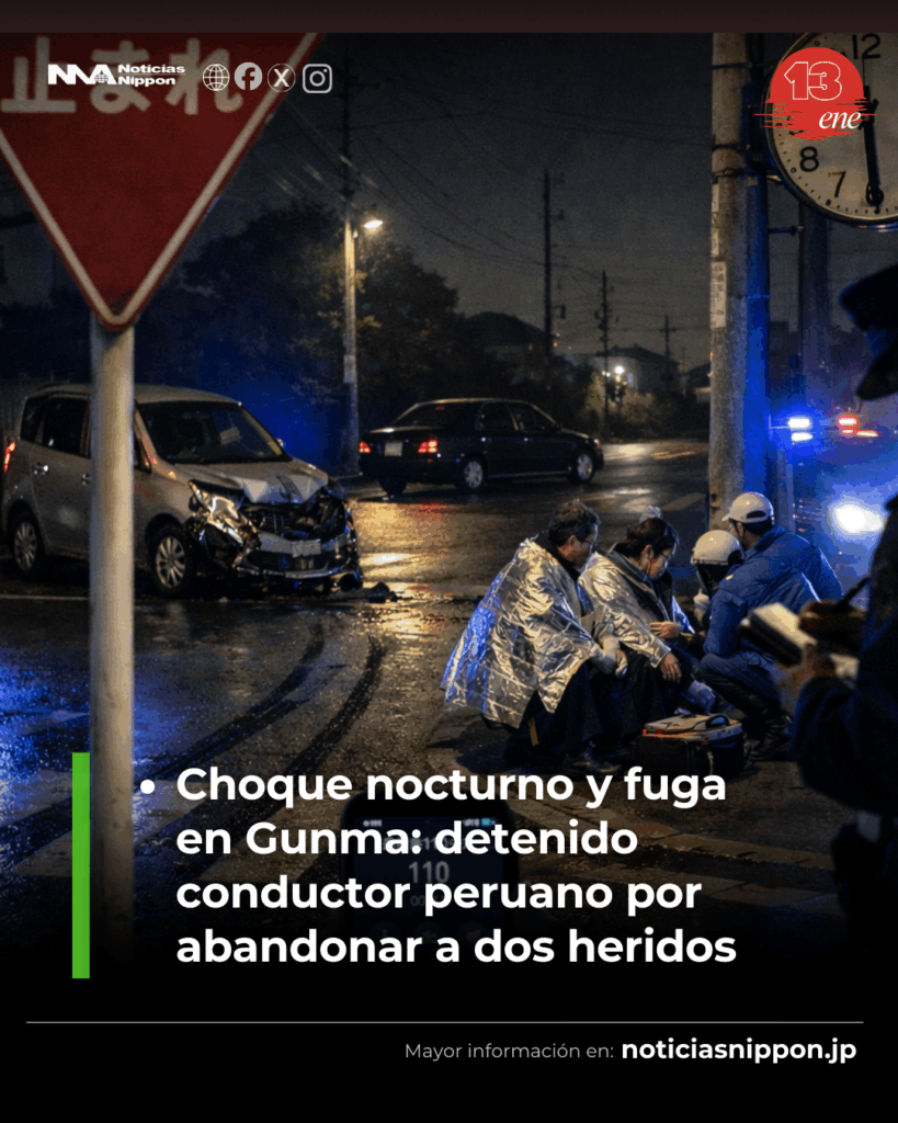 La noche del pasado 29 de diciembre, en un cruce sin semáforo de la ciudad de Ōta, prefectura de Gunma, el silencio fue roto por el estruendo de un impacto. Un automóvil particular colisionó violentamente contra un kei-car en el que viajaban un hombre y una mujer, quienes resultaron con heridas leves. El conductor responsable, lejos de auxiliar a las víctimas, abandonó su vehículo y huyó a pie, perdiéndose entre la oscuridad.