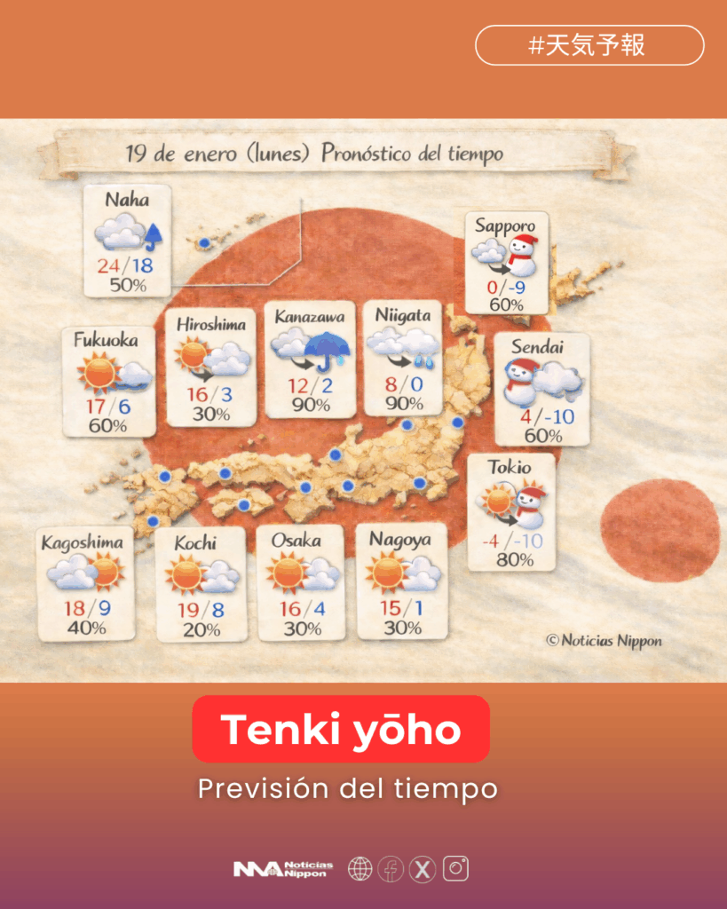 Este lunes, el mapa meteorológico oficial mostrará un Japón dividido en dos grandes realidades: al norte, pleno ambiente invernal con nieve y frío intenso; al centro y sur, cielos más estables, con sol, nubes y temperaturas relativamente suaves para esta época.