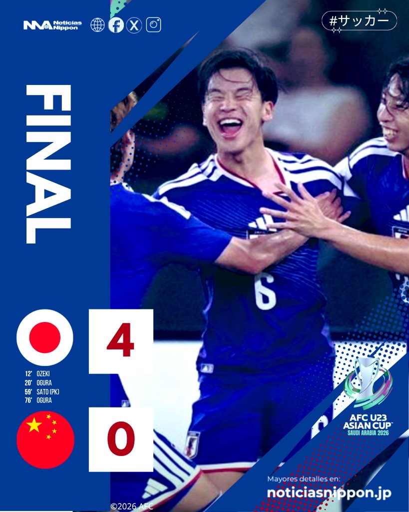 Bajo las luces del AFC U23 Asian Cup Saudi Arabia 2026, Japón escribió una noche de oro. Con fútbol valiente, presión asfixiante y una serenidad que solo tienen los campeones, la selección nipona aplastó 4–0 a China PR en la final disputada en el Prince Abdullah Al Faisal Sports City Stadium, convirtiéndose en el primer equipo en defender el título y levantar el trofeo por tercera vez.