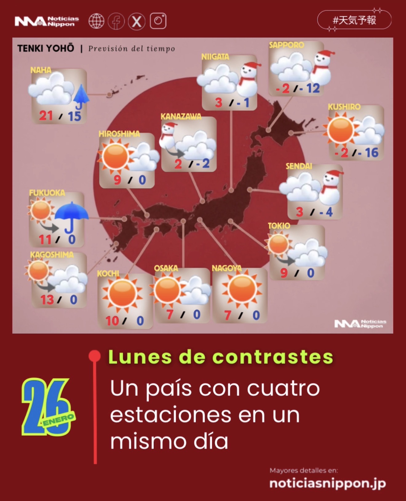 Japón despierta este lunes bajo un cielo que cuenta muchas historias a la vez. El país amanece dividido entre el invierno que aprieta con fuerza en el norte y la calma luminosa que se abre paso en el oeste y el sur. Es un día de contrastes nítidos, de respiraciones visibles en Hokkaidō y de pasos tranquilos bajo el sol en Kansai y Kyūshū.