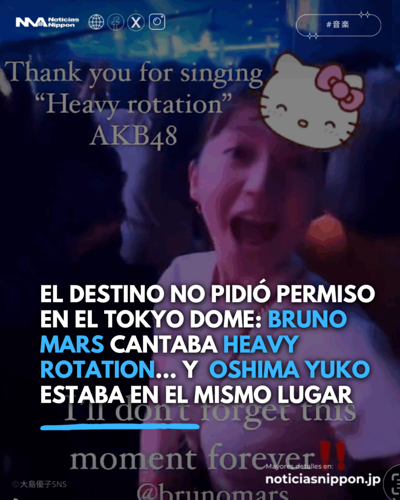 Hay casualidades… y luego están esas que parecen escritas por el destino con marcador fluorescente. Una de esas ocurrió cuando Bruno Mars, en pleno concierto en un domo japonés, decidió cantar Heavy Rotation. Sí, esa Heavy Rotation, el himno generacional de AKB48 que marcó una era del pop japonés. Hasta ahí, ya era un momento de locura colectiva. Pero el verdadero giro de guion vino después.