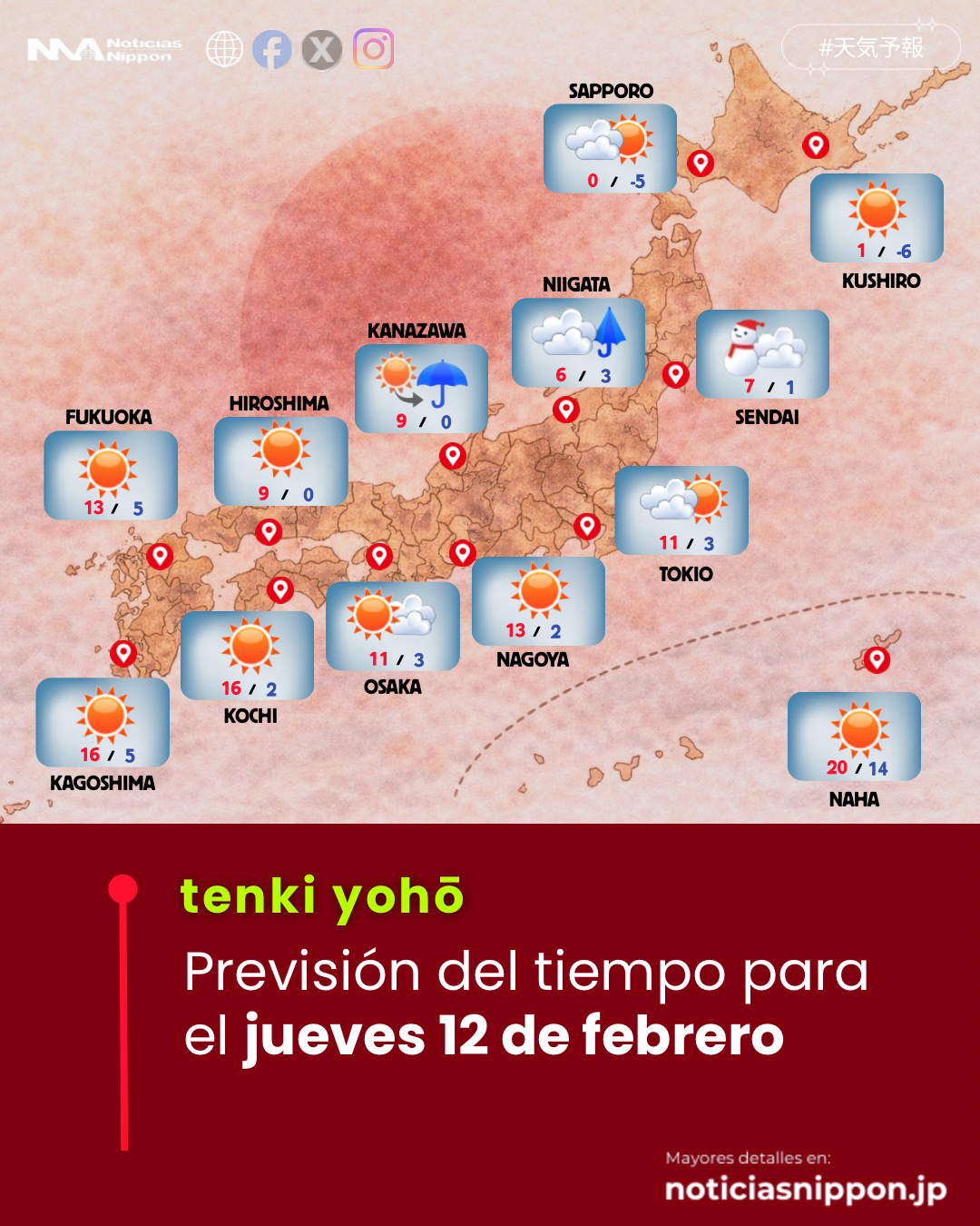 - Sendai: cielo mayormente nublado, con temperaturas de 7 °C / 1 °C.