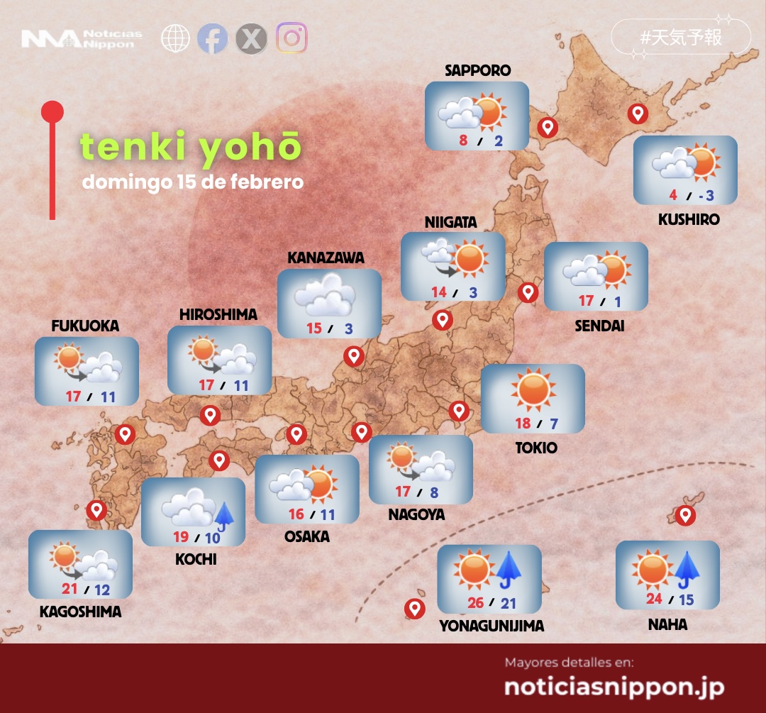 Este patrón climático responde a una masa de aire frío instalada en el norte y un flujo más cálido y húmedo proveniente del sur. La transición estacional comienza a insinuarse gradualmente, aunque febrero sigue mostrando su doble rostro: invierno riguroso en Hokkaidō y anticipo de primavera en Okinawa.