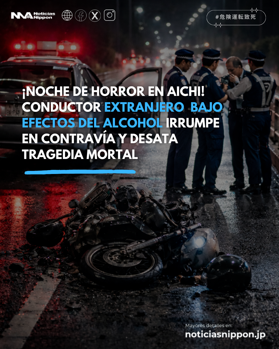 Lo que siguió fue una escena devastadora: un impacto brutal contra una motocicleta y otro vehículo. El conductor de la moto, Shingo Katō (26), trabajador de la ciudad de Okazaki, perdió la vida tras el violento choque. Tenía solo 26 años. Una edad donde el futuro apenas empieza a escribirse.