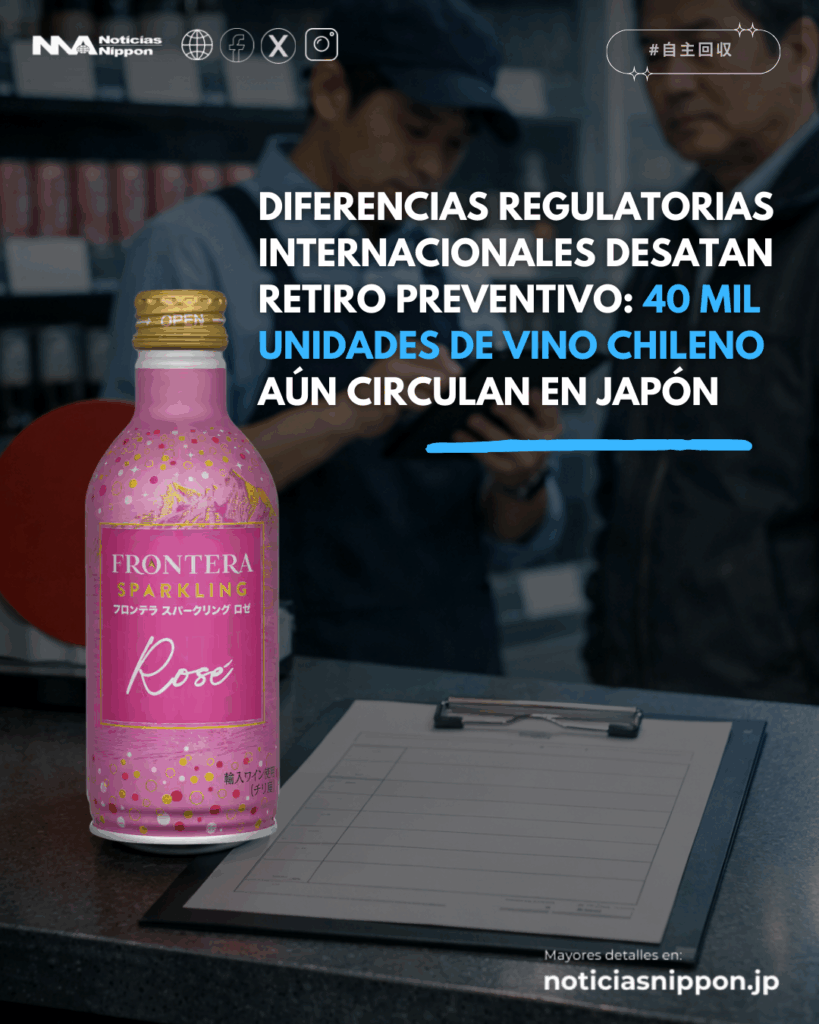 Mercian Corporation anunció hoy martes el retiro voluntario de tres productos de vino de origen chileno, luego de confirmarse que en su proceso de fabricación se utilizó un aditivo alimentario no autorizado en Japón. La medida afecta principalmente al producto en lata “Frontera Sparkling Rosé”, junto con “Frontera Ice Rosé Rose (lata)” y “Frontera Rosé (botella)”, todos lanzados a partir de 2024.
