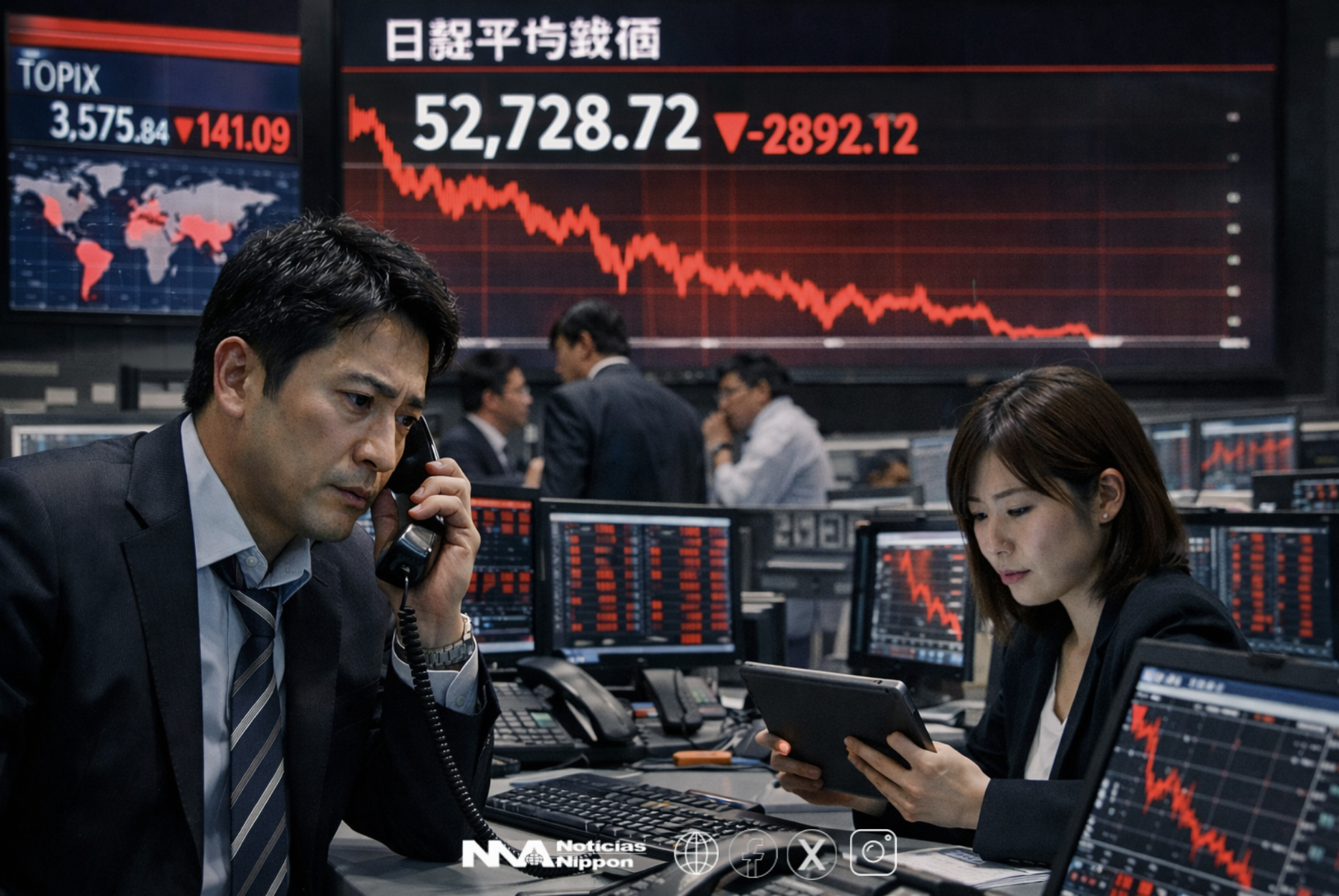 Hoy lunes comenzó con una escena de tensión pocas veces vista en el mercado financiero japonés. En el parqué de la Bolsa de Tokio, los indicadores se teñían de rojo a medida que avanzaba la jornada. El índice Nikkei 225 se desplomó 2892,12 yenes, cerrando en 52.728,72 puntos, una caída del 5,2%, la tercera mayor pérdida diaria registrada en la historia del índice.
