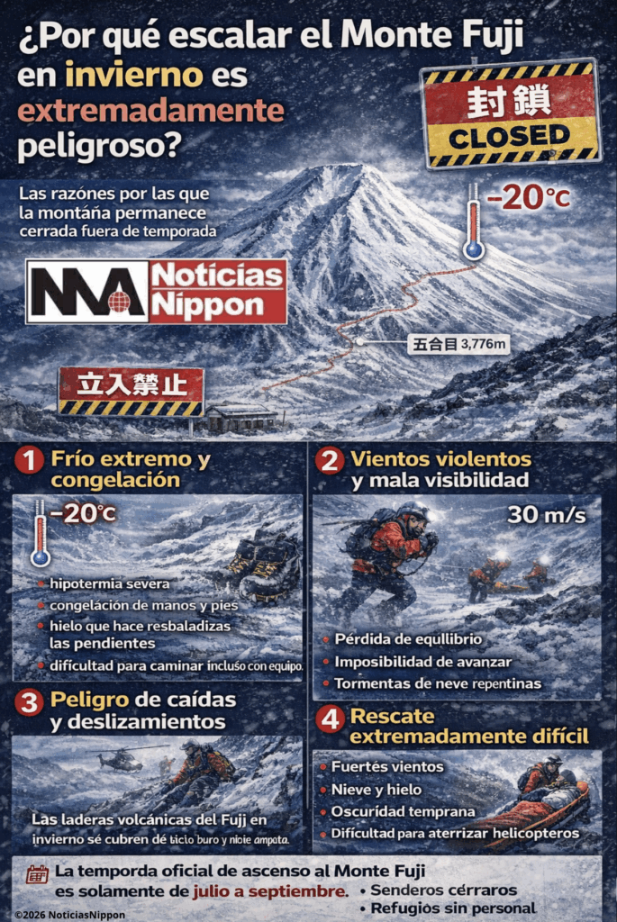 Las autoridades recordaron que el Monte Fuji se encuentra actualmente en temporada de cierre, periodo durante el cual los senderos oficiales permanecen bloqueados y sin servicios de rescate permanentes, precisamente por el elevado riesgo de accidentes en condiciones invernales.