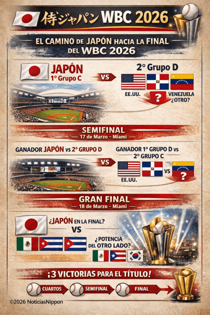 En el Clásico Mundial de Béisbol 2026, el cuadro del torneo establece que el ganador del Grupo C —posición que ya aseguraron los Samurai Japan se enfrentará en los cuartos de final al segundo lugar del Grupo D.