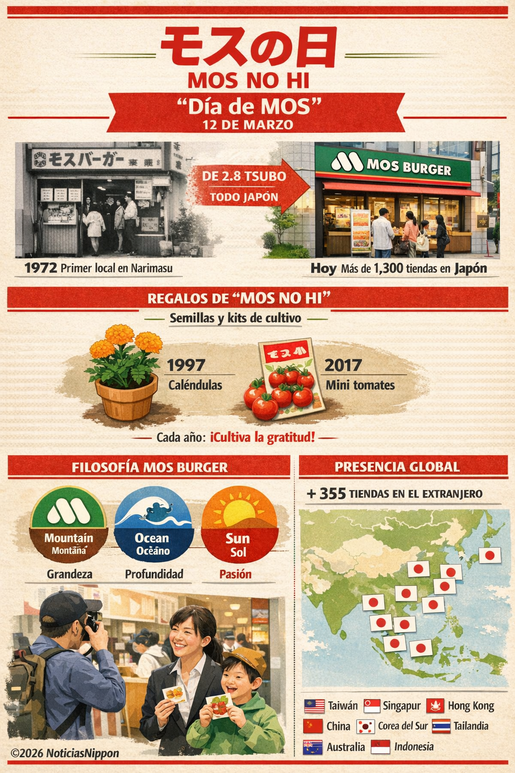 Cada 12 de marzo, Japón recuerda el nacimiento de una de sus marcas gastronómicas más emblemáticas: モスの日 (Mosu no Hi — Día de MOS). La fecha conmemora el momento en que, en 1972 (Showa 47), abrió en Narimasu, Tokio, el primer local experimental de la cadena MOS Burger, una pequeña tienda de apenas 2,8 tsubo (unos 9 m²) situada frente a la estación Narimasu de la línea Tobu Tojo.