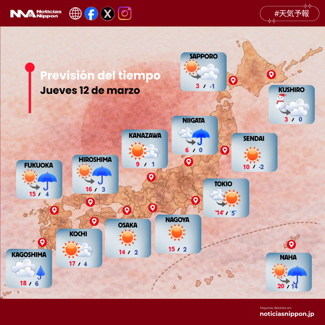 El jueves 12 de marzo será, en apariencia, un día mayormente soleado en gran parte de Japón, pero la combinación de aire frío en altura, fuertes contrastes regionales y niveles extremos de polen convierte la jornada en una de las más características de la primavera japonesa: cielos despejados, aire fresco y alergias en pleno auge.