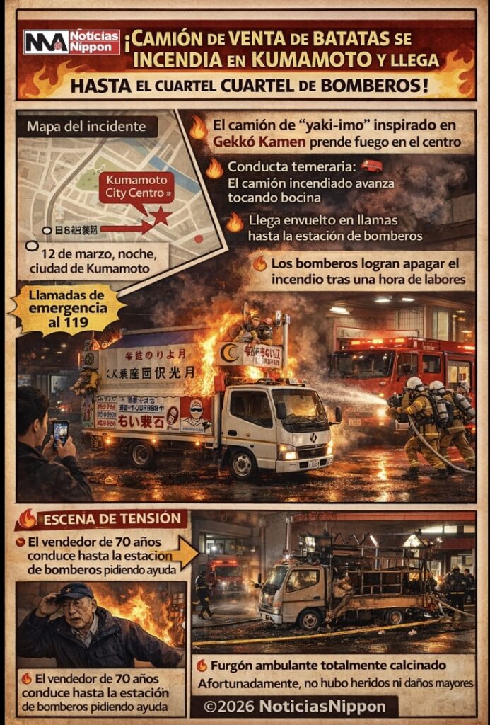 Una escena digna de una película de acción sorprendió la noche del 12 de marzo en el corazón de Kumamoto, cuando un conocido camión de venta ambulante de yaki-imo (batatas asadas) terminó completamente calcinado tras dirigirse en llamas hasta una estación de bomberos. El vehículo, famoso en la ciudad por su llamativa decoración inspirada en el héroe clásico japonés Gekkō Kamen, comenzó a incendiarse mientras circulaba por el centro urbano cerca de la Kumamoto Station, generando múltiples llamadas de emergencia de ciudadanos que reportaban “un camión ardiendo que seguía avanzando por la carretera”.