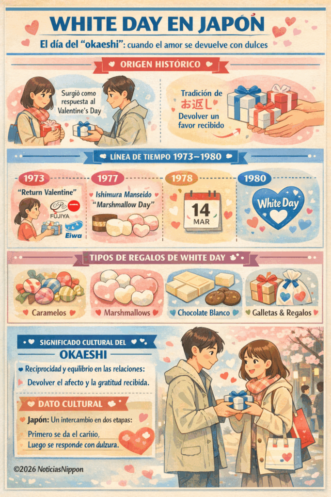 Hoy, décadas después, White Day se ha convertido en una tradición única del calendario japonés, un reflejo de cómo Japón adapta influencias extranjeras y las transforma en rituales culturales propios. Cada 14 de marzo, entre escaparates blancos y dulces delicados, miles de personas repiten un gesto simple pero profundamente humano: agradecer el cariño recibido y devolverlo con dulzura.