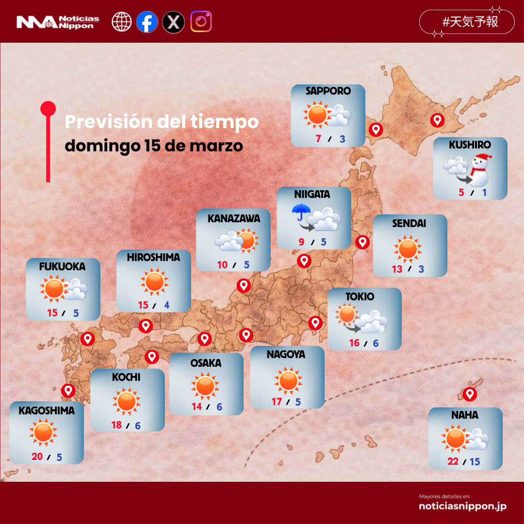 Japón vivirá un domingo agradable y luminoso en el lado del Pacífico, perfecto para salir o pasear, pero con niveles elevados de polen que podrían afectar a millones de personas. En cambio, el norte y el lado del Mar de Japón deberán vigilar la lluvia o nieve pasajera.