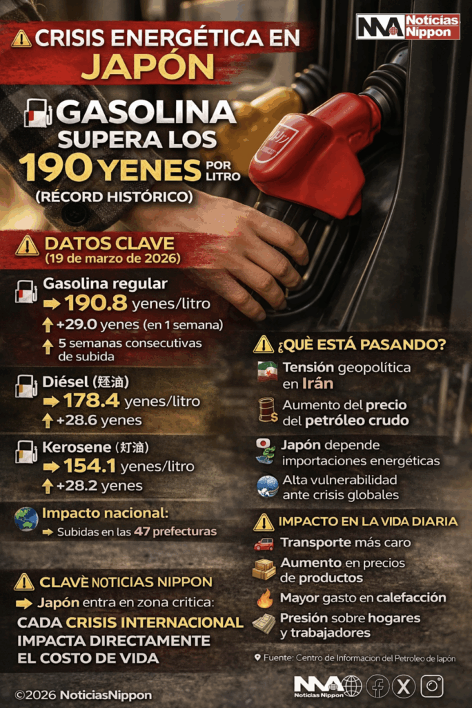 Japón enfrenta un nuevo golpe al bolsillo de los consumidores: el precio promedio de la gasolina ha superado por primera vez en la historia los 190 yenes por litro, alcanzando los 190.8 yenes, según datos oficiales publicados este miércoles. Se trata de un aumento abrupto de 29 yenes en tan solo una semana, marcando cinco semanas consecutivas de alzas y reflejando el impacto directo de la creciente inestabilidad geopolítica en Medio Oriente.