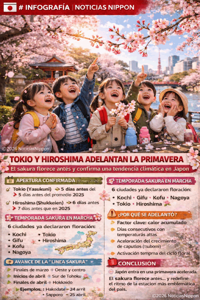 La señal no es aislada. En Hiroshima (Shukkeien), la floracion fue aun mas acelerada, con un adelanto de 6 dias frente al promedio y 7 dias respecto al año pasado. Este doble anuncio consolida un patron regional: el oeste y el centro de Japon estan entrando en primavera con mayor rapidez de lo habitual.