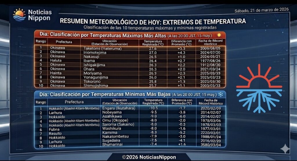 Este sábado 21 de marzo, el desplazamiento de un sistema de altas presiones trajo cielos despejados y una notable subida de las temperaturas desde la región de Kanto hacia el oeste. A pesar de un inicio de jornada frío debido al enfriamiento por radiación en las zonas del interior, el termómetro ascendió rápidamente durante la tarde.