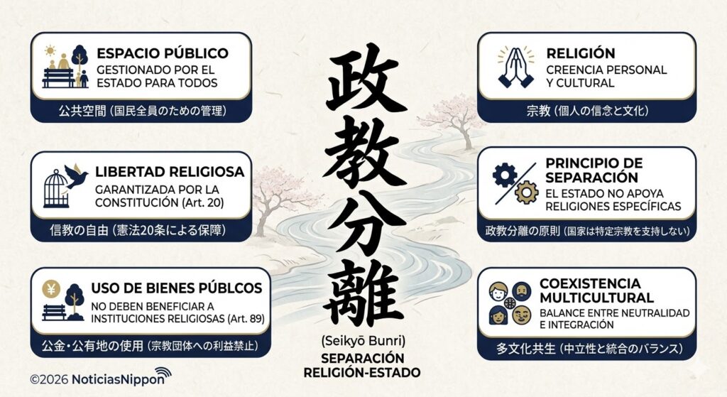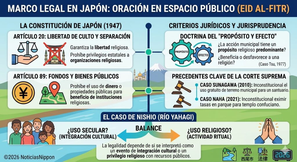 Para comprender el debate jurídico generado en Nishio por el Eid al-Fitr, es necesario analizar el marco legal japonés, que se caracteriza por una interpretación estrictamente laica pero que, en la práctica, busca un equilibrio entre la neutralidad del Estado y la libertad de culto.