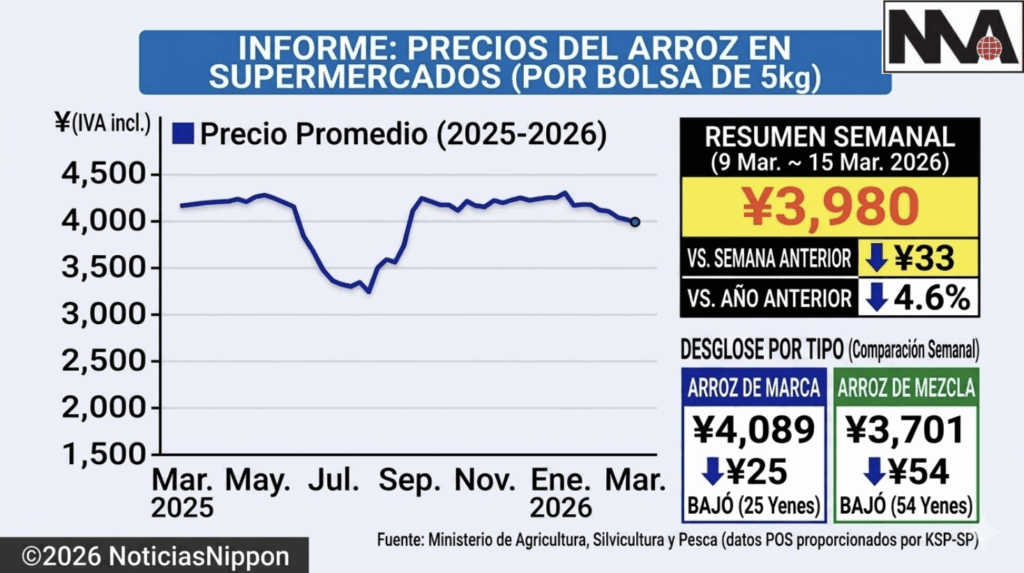 Hacía aproximadamente siete meses que los precios no regresaban al rango de los 3,000 yenes. La última vez que se observaron niveles similares fue a finales de agosto de 2025, periodo en el que circuló una gran cantidad de arroz de reserva bajo contratos voluntarios.