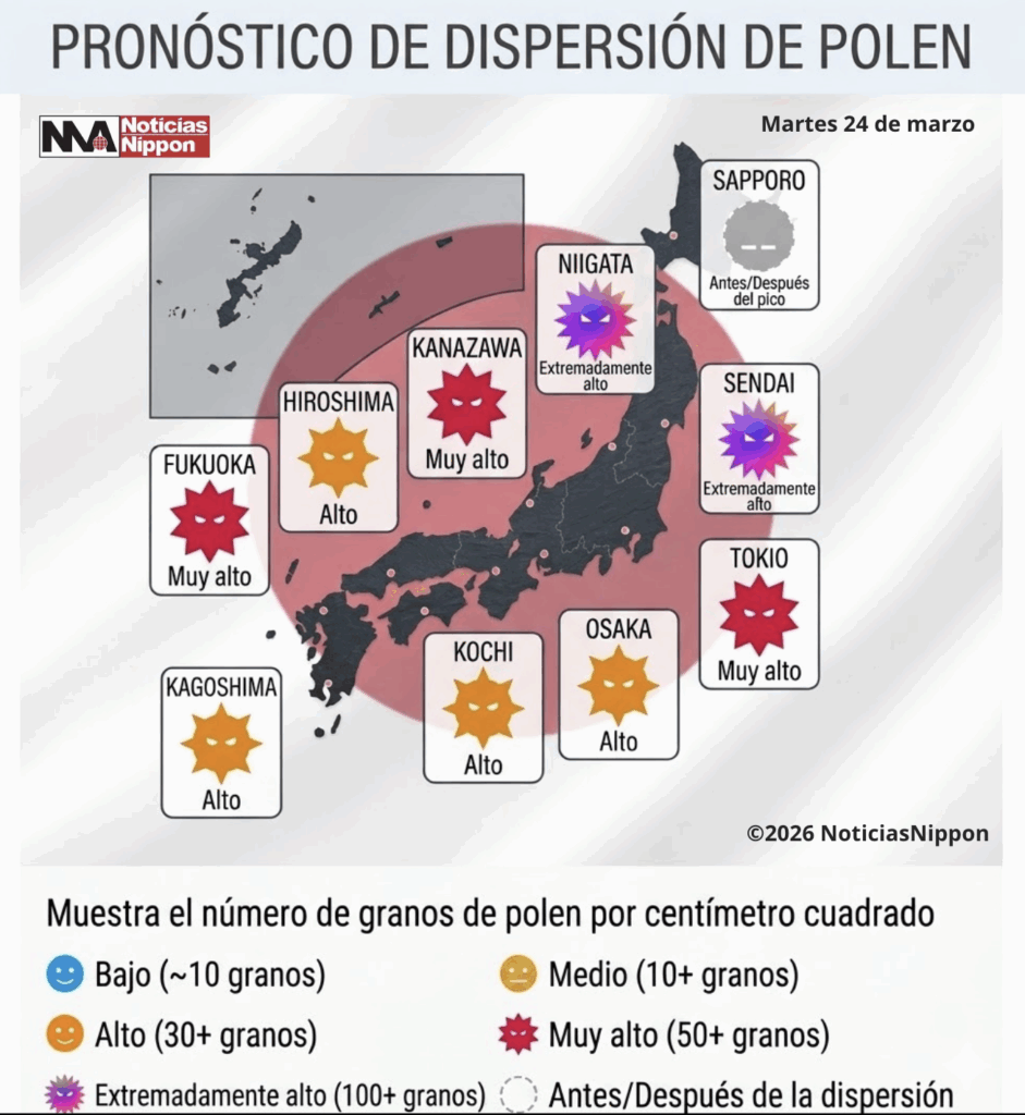Nivel Extremo (más de 100 granos por ): Nagoya, Niigata y Sendai.