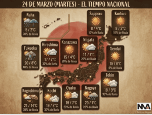 En contraste, el sur del país presenta mayor inestabilidad. Regiones como Fukuoka, Kochi, Kagoshima y especialmente Naha (Okinawa) registran altas probabilidades de lluvia, alcanzando hasta el 70%. A pesar de temperaturas más cálidas, este patrón húmedo refleja la influencia de sistemas atmosféricos que comienzan a intensificarse en esta época del año.