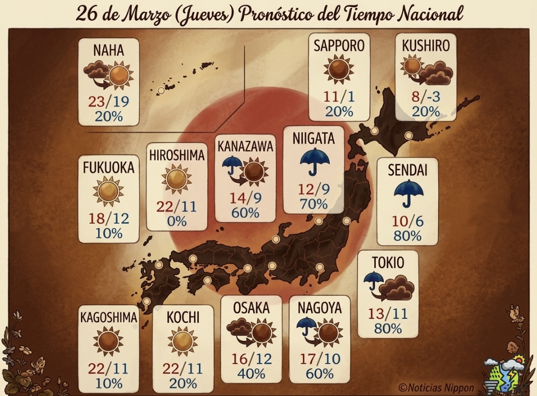La jornada del 26 de marzo evidencia el fuerte contraste climático que caracteriza la transición hacia la primavera en Japón. Mientras el oeste avanza hacia condiciones cálidas y despejadas, el este permanece bajo la influencia de lluvias frías. Paralelamente, el incremento del polen añade un factor de riesgo silencioso que impacta directamente en la salud y el bienestar cotidiano de millones de personas.