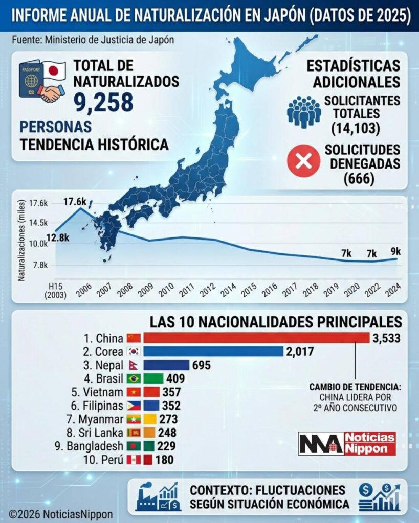 El Ministerio de Justicia de Japón reveló recientemente que el número de ciudadanos extranjeros que obtuvieron la nacionalidad japonesa (naturalización) durante el año 2025 ascendió a 9,258 personas. Según el informe, los ciudadanos procedentes de China representaron el grupo más numeroso con aproximadamente 3,500 personas, manteniendo la posición más alta por segundo año consecutivo.