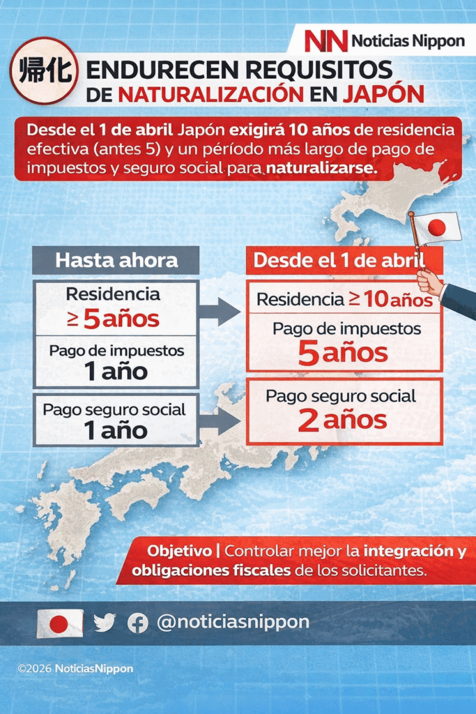 En un giro significativo en la política migratoria de Japón, el gobierno anunció el endurecimiento de los requisitos para la obtención de la nacionalidad japonesa mediante el proceso de 「帰化」 (kika, naturalización). A partir del 1 de abril, las autoridades elevarán en la práctica el tiempo mínimo de residencia exigido de 5 a 10 años, marcando una clara señal de mayor rigor en la evaluación de los solicitantes extranjeros.