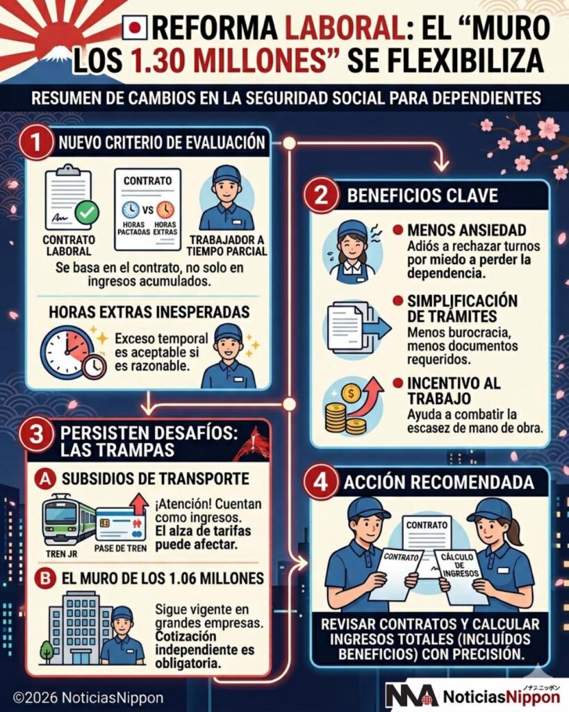 • El Muro de los 1,06 millones: Bajo las enmiendas aplicadas recientemente (y que se expandirán en octubre de 2024), los empleados en empresas con más de 51 trabajadores que ganen más de 88,000 yenes mensuales (aprox. 1,06 millones anuales) y trabajen más de 20 horas semanales deben inscribirse obligatoriamente en el seguro social, perdiendo la dependencia independientemente del límite de los 1,30 millones.