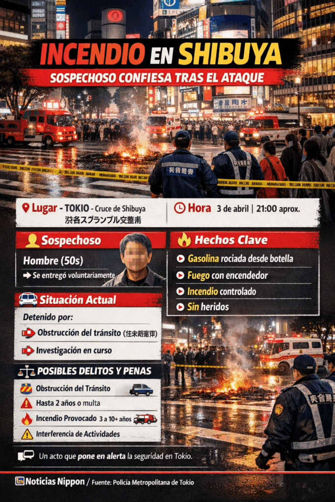 De acuerdo con la Policía Metropolitana de Tokio (警視庁), el incidente ocurrió poco después de las 9:00 p.m., cuando varias personas alertaron sobre la presencia de fuego en plena intersección frente a la estación JR Shibuya. En el lugar, restos de botellas de plástico en llamas evidenciaban un acto deliberado. La rápida intervención de las autoridades evitó que el fuego se propagara en una zona densamente concurrida.