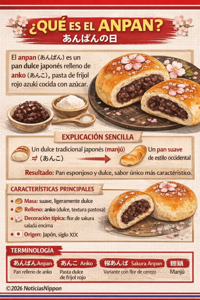 El anpan (あんぱん) es un pan dulce japonés relleno de anko (あんこ), una pasta hecha principalmente de frijoles rojos azuki cocidos con azúcar. Es uno de los productos más emblemáticos de la panadería japonesa.