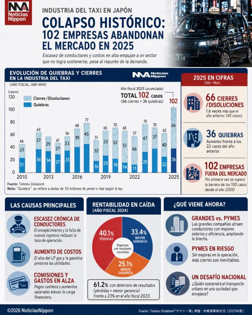 El colapso del sector del taxi en Japón durante 2025 no es un simple bache estadístico, sino una hemorragia sistémica que ha dejado un rastro de 102 empresas fuera de combate. Este récord histórico, documentado por Teikoku Databank, revela una fractura profunda en la movilidad nipona: las quiebras y los cierres voluntarios se han disparado, alcanzando una ferocidad que multiplica por 1.6 las cifras del año anterior. Lo que estamos presenciando es el desmoronamiento de un pilar del transporte urbano que, hasta hace poco, se consideraba inamovible.
