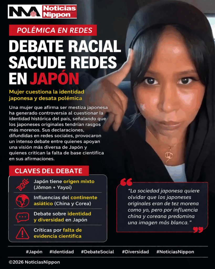 Una mujer que se identifica como mestiza japonesa ha generado polémica al cuestionar la identidad actual de Japón, afirmando que se ha invisibilizado un supuesto origen de rasgos más morenos debido a influencias históricas de China y Corea que habrían “blanqueado” la imagen predominante.