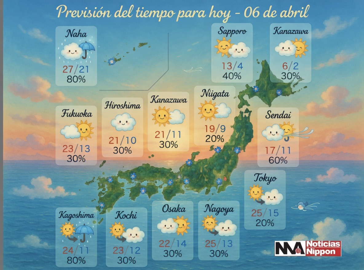 Japón vive este lunes un marcado contraste climático que anticipa el cambio de estación. Desde la región de Kanto hasta Kyushu, el país experimenta un día mayormente soleado con temperaturas en ascenso que rozan —e incluso superan— niveles propios del verano, mientras que en el extremo sur y suroeste se encienden las alertas por lluvias intensas y tormentas eléctricas.
