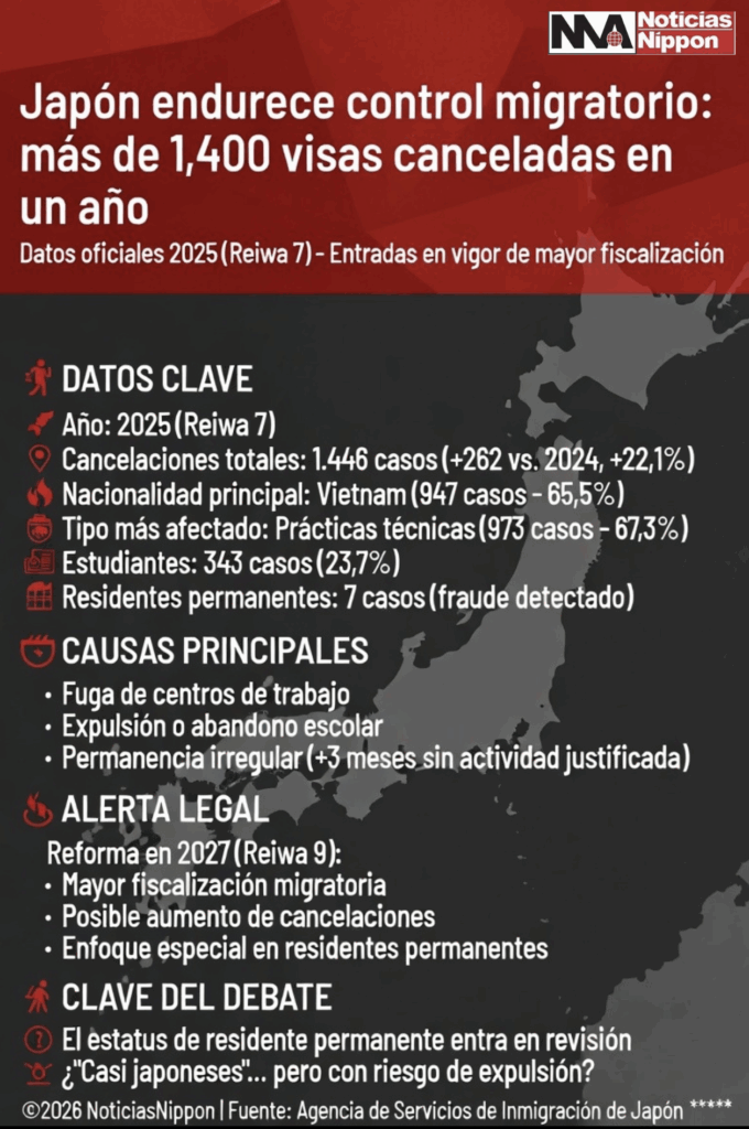 El aumento de cancelaciones, especialmente entre estudiantes y trabajadores técnicos, revela grietas en los sistemas de integración y supervisión. Sin embargo, el verdadero punto de inflexión será cómo el Estado gestione el estatus de los Eijū-sha / 永住者, una categoría que hasta ahora había sido considerada casi intocable.
