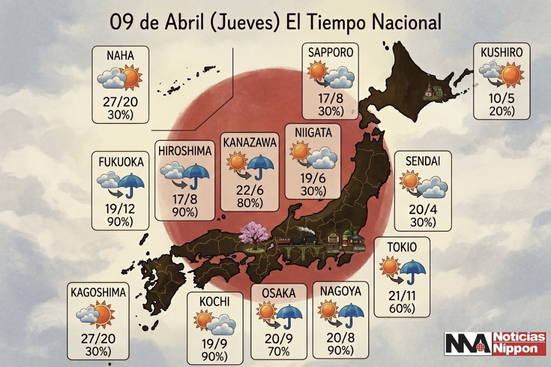 Desde primeras horas del día, el deterioro del clima comienza a sentirse en el oeste del país. En la región de Kyūshū, las precipitaciones se intensifican gradualmente, con especial preocupación en el norte, donde se prevén lluvias acompañadas de actividad eléctrica e incluso episodios de precipitaciones intensas en cortos periodos. La atmósfera inestable aumenta el riesgo de tormentas localizadas.