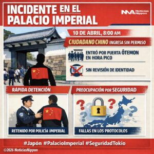 En una escena que ha generado inquietud en los círculos de seguridad de Japón, un ciudadano de nacionalidad china logró ingresar sin autorización al interior del Palacio Imperial (皇居 / Kōkyo) durante la mañana de este jueves, en pleno horario de alta circulación de funcionarios.
